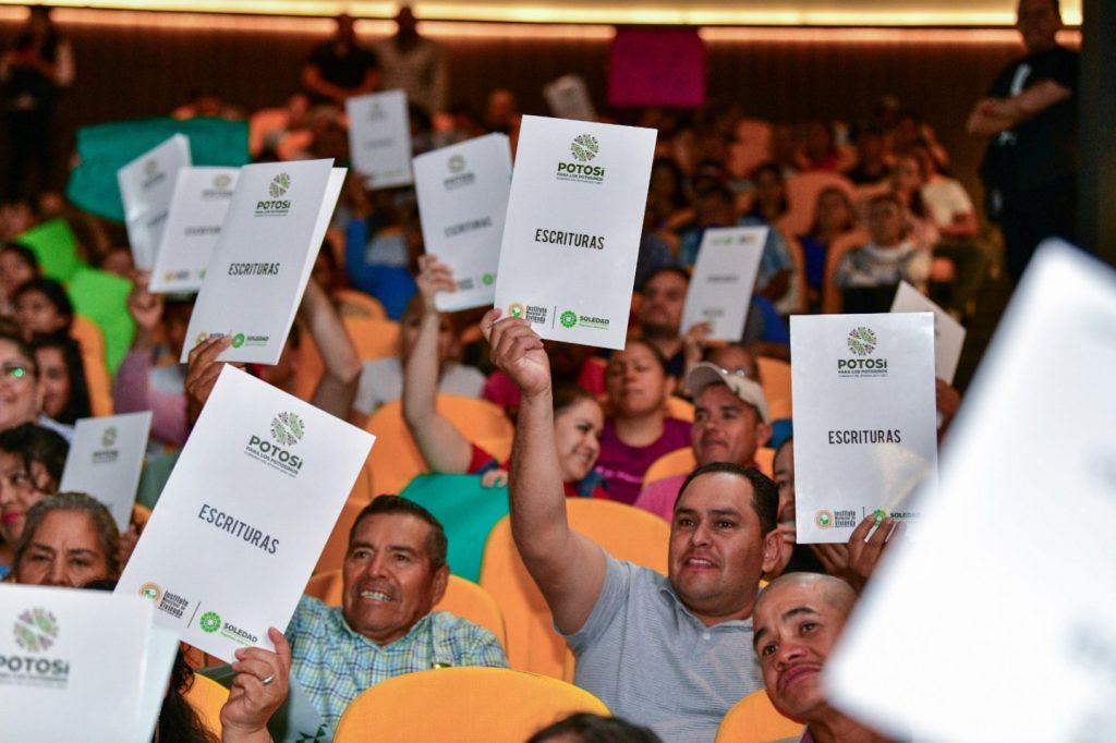 Agradeció a los notarios que agilizaron los trámites y a la presidenta municipal, Leonor Noyola, por su apoyo para la regularización; invitó a las familias a celebrar porque cuentan con la certeza jurídica de sus propiedades, para heredar a sus descendientes y la seguridad de que nadie podrá quitárselas.