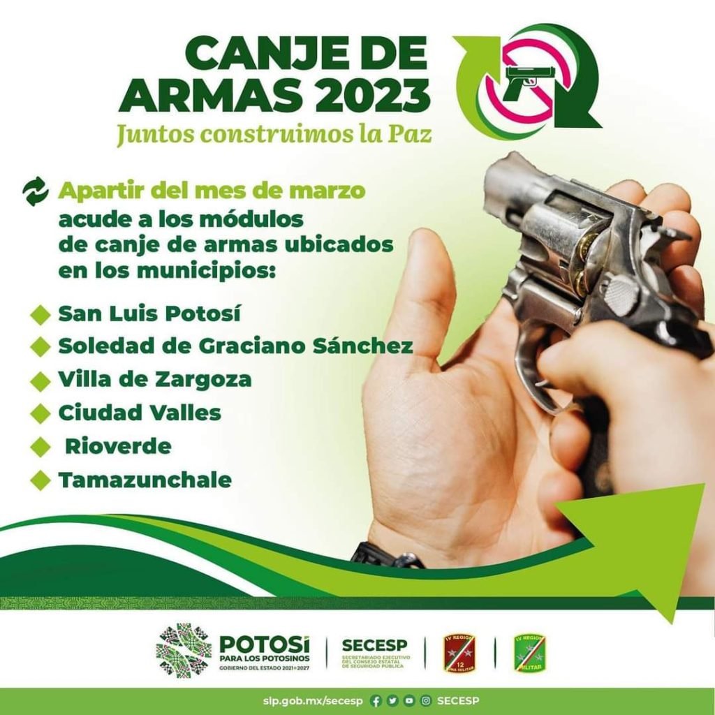 Con el compromiso de promover la paz y la seguridad en San Luis Potosí, el Gobierno del cambio que encabeza Ricardo Gallardo Cardona, en coordinación con la Secretaría de la Defensa Nacional (Sedena), a través de la IV Región Militar y de la 12/a. Zona Militar, implementarán la campaña denominada “Canje de armas 2023, Juntos construimos la Paz”, dio a conocer la titular del Secretariado Ejecutivo del Consejo Estatal de Seguridad Pública (SECESP), Ana Elisa Loredo Torres.