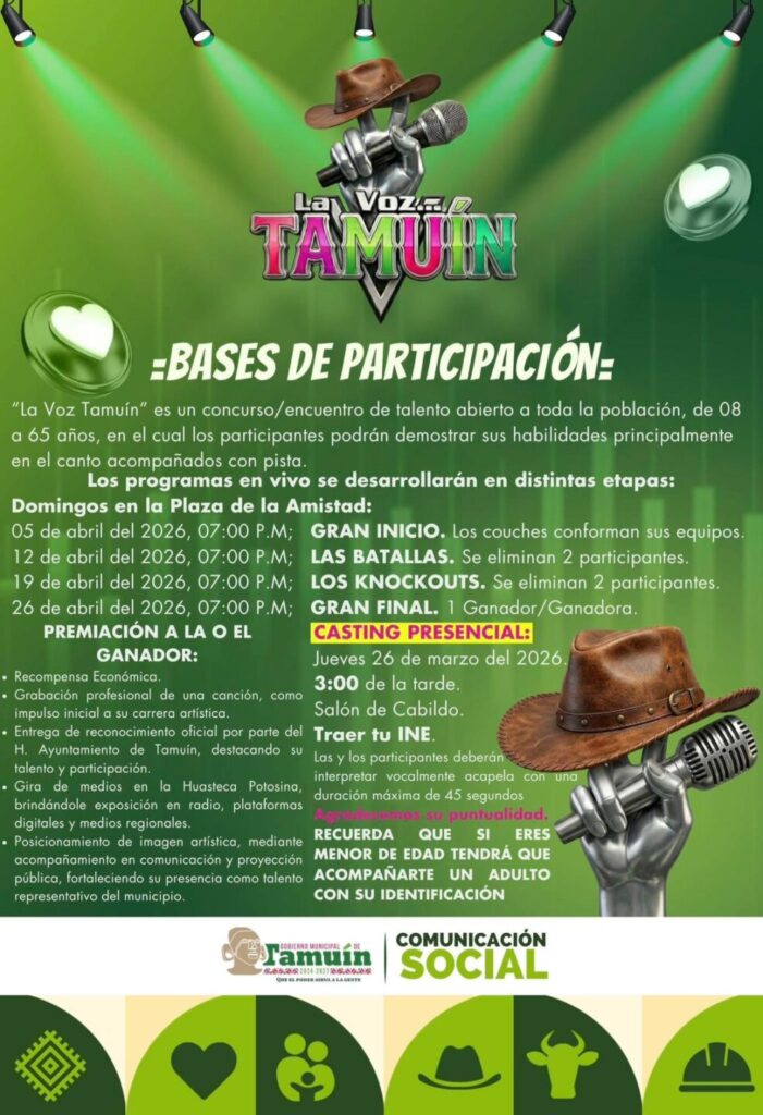El Gobierno Municipal de Tamuín, que preside Marcelino Bautista Rincón, invita a todas y todos los talentos a formar parte de La Voz Tamuín, un espacio donde tu voz puede brillar.