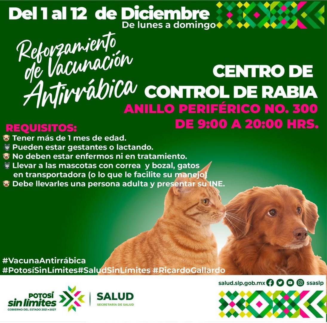 A partir del lunes 1 de diciembre, personal de los Servicios de Salud, en coordinación con IMSS Bienestar, el Instituto Potosino de la Juventud, los ayuntamientos de Soledad, Villa de Pozos, San Luis Potosí y las Delegaciones Bocas y La Pila, así como la comunidad de Escalerillas e instancias públicas y veterinarias privadas, activarán diversos puntos de vacunación. Además del servicio habitual en el Hospital y Refugio Huellitas cada miércoles, durante diciembre se aplicarán vacunas de lunes a viernes de 9:00 a 14:00 horas, y el domingo 7 de diciembre en Tequis y bulevar Río Españita.