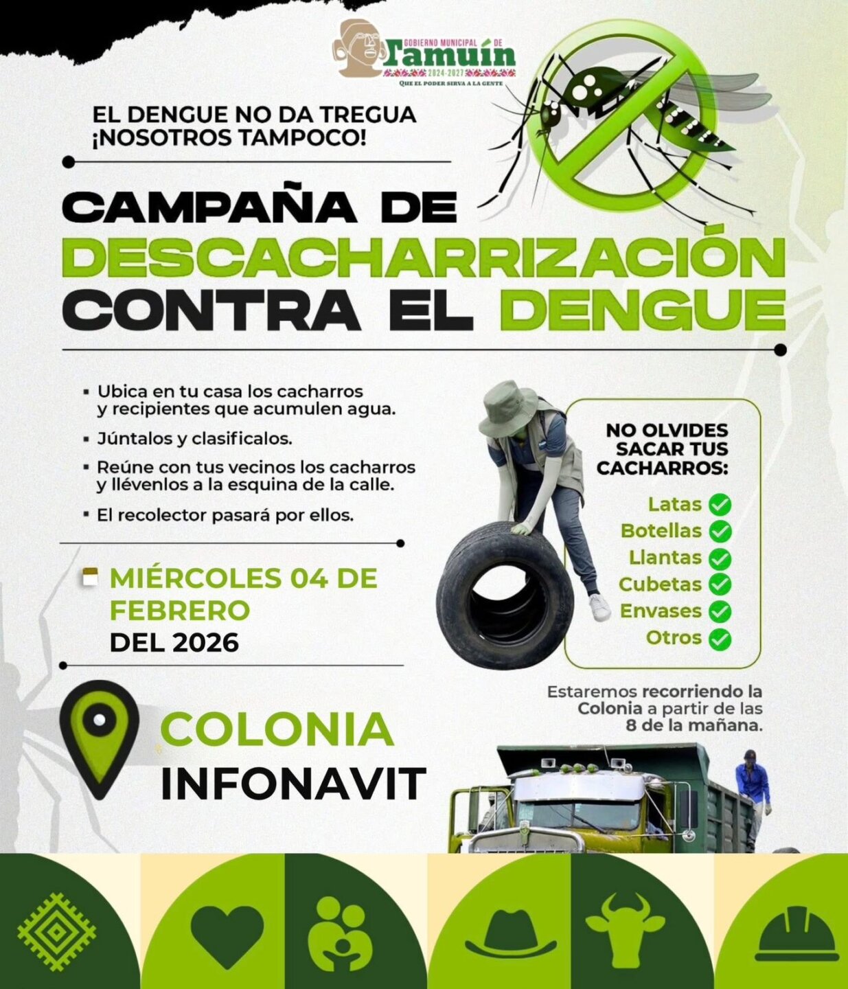 El Ayuntamiento de Tamuin que Preside Marcelino Bautista Rincón a través de la Coordinación de Salud a cargo del Dr. José Luis Medina Gudiño, llevará a cabo una jornada de descacharización el día de mañana 04 de febrero del 2026, en la colonia «Infonavit».